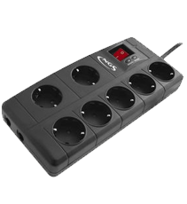 Powerstrip protectrice avec 5+1 connecteurs pour connecter jusqu'à 6 appareils au réseau électrique et 2 lignes téléphoniques/fax/données, SURGE 600 TEL a été crée pour prolonger la vie de vos équipements, impacts des rayons, piques et interférences. Le sixième connecteur est séparé pour connecter le transformeur, comme ceux qui sont utilisés dans les scanners etc. Assurance de 150.000€ pour des équipements abîmés par surcharge électrique pendant qu'ils sont connectés au SURGE 600 TEL