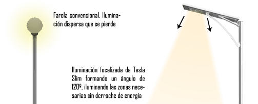 Una de las cualidades de Tesla Slim es que su iluminación esta enfocada formando un ángulo de 120º por lo que no se desperdicia energía iluminando zonas superiores y produciendo contaminación lumínica. Las farolas solares Tesla Slim sólo alumbrarán las zonas que son realmente necesarias, además gracias a su sensor pcrepuscular pueden ser programadas para que se enciendan únicamente con la presencia de algún viandante por lo que se incrementa el ahorro de la energía.