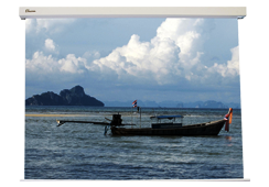 Pantalla electrica, con cajón de aluminio lacado en blanco, con motor electrico con interruptor de subida-baja-paro, tela blanco mate anti reflectante con clasificacion ignifuga, frontal 0,5 mm de espesor |