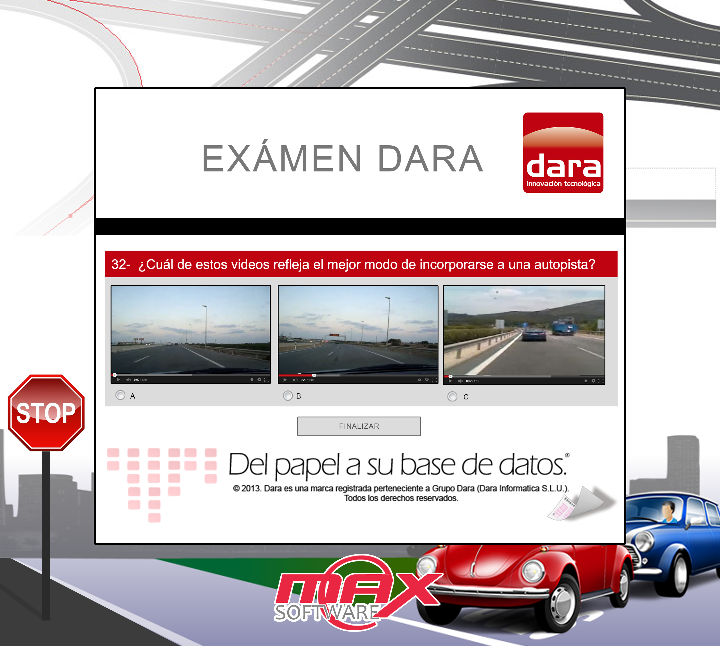 En la imagen que se muestra en la parte derecha de estas líneas se puede observar un ejemplo de examen de autoescuela. En él se puede seleccionar la respuesta correcta contemplando varios vídeos como opciones. Con INTEGRA MAX puede añadir vídeos, imágenes, sonidos, textos o enlaces a webs a las opciones de respuesta de sus test y encuestas. De manera sencilla y cómoda.