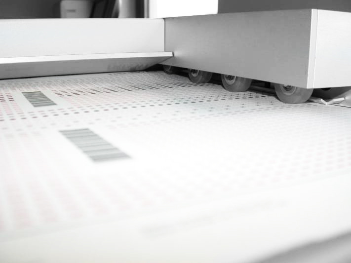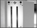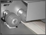 Detalle de la cabeza lectora de marcas (derecha), y código de barras (izquierda). |