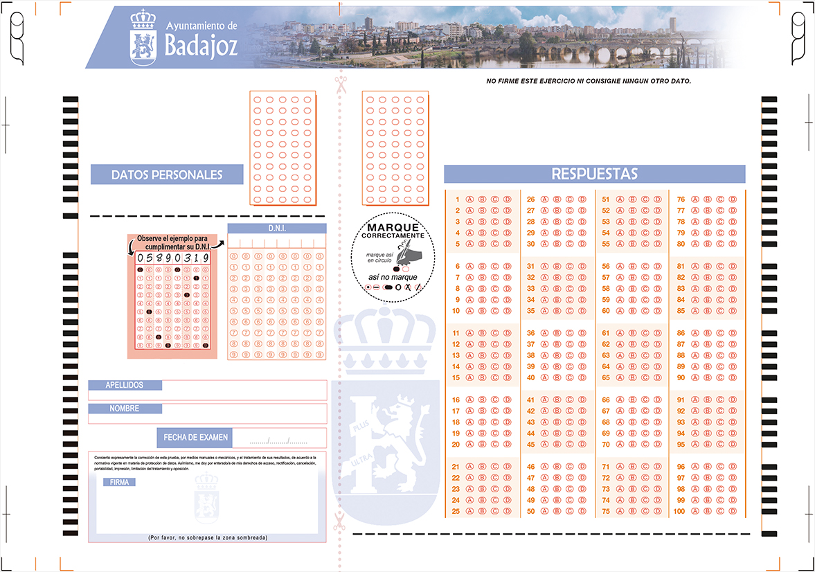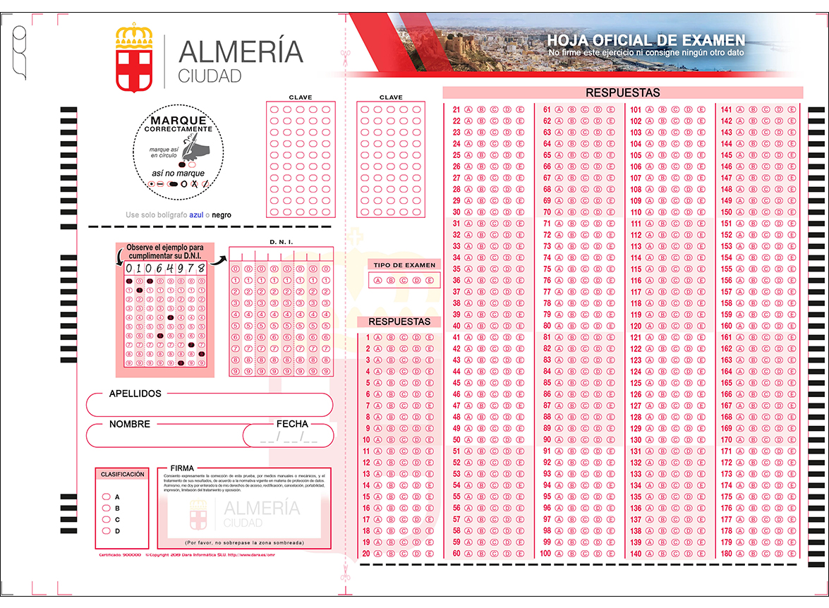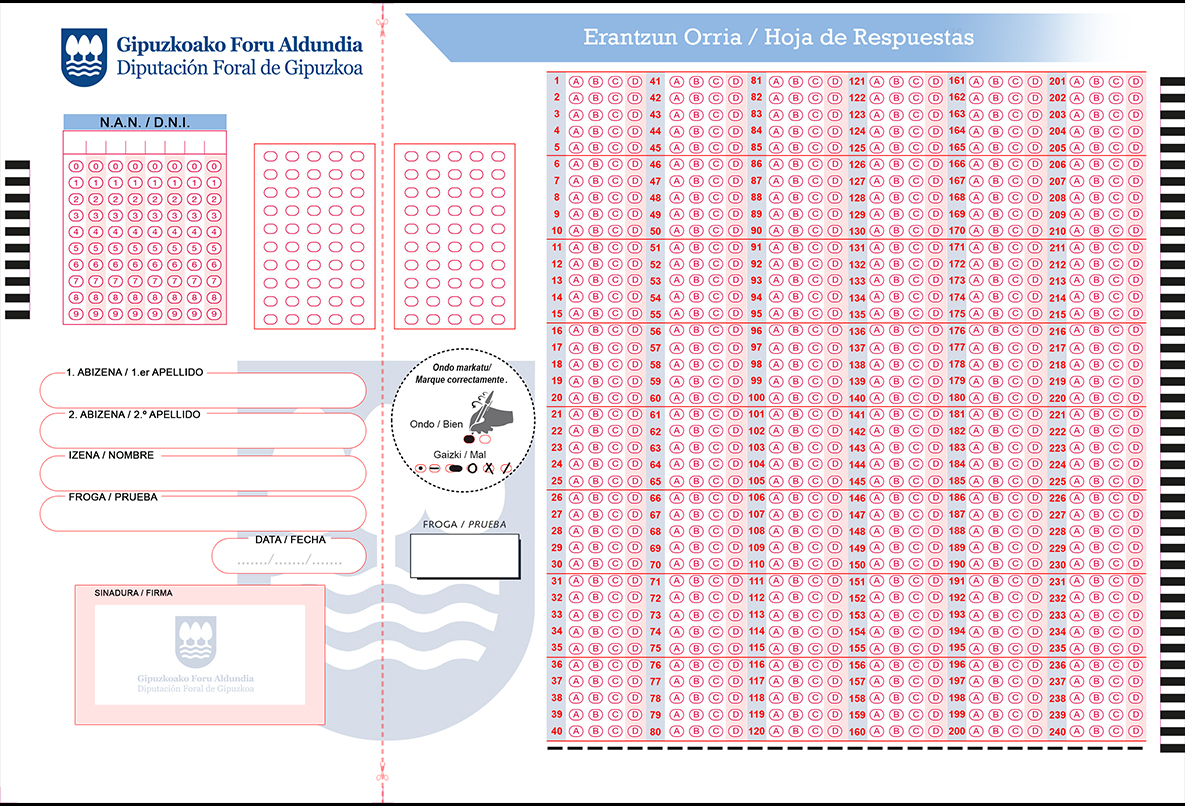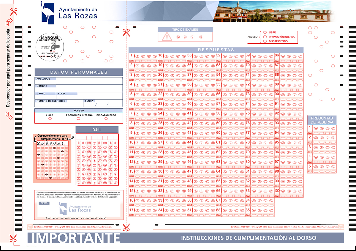 Podemos facilitarle todo lo necesario para la realización de su proceso de selección. Los impresos a cumplimentar (personalizados si lo desea con el logotipo de su centro, administración, ente o empresa) , su posterior lectura automática en sus instalaciones, evaluación y obtención de las calificaciones finales siguiendo sus especificaciones, obtención e impresión de informes directos de los resultados y elaborados según necesidades.